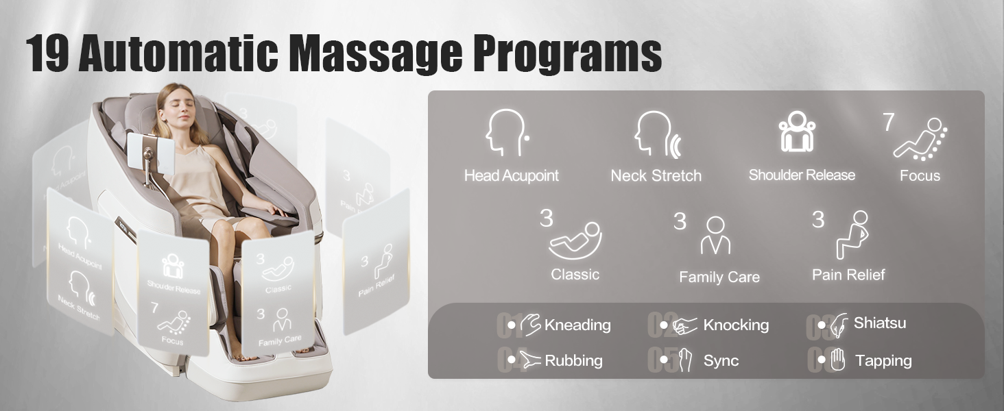 • 3D massage Chair: ROTAI massage chair is equipped with an advanced flexible 3D motion chip. Compared to the traditional massage chairs, it adapts to the body curve more comfortably and the compression effect is more comfortable. Unlike fixed massage heads, it can simulate the techniques of a professional masseur, with 19 different automatic programs, 6 different massage modes and 5 speed settings to effectively relieve muscle pain and experience the massage effect as if you experienced it yourself.