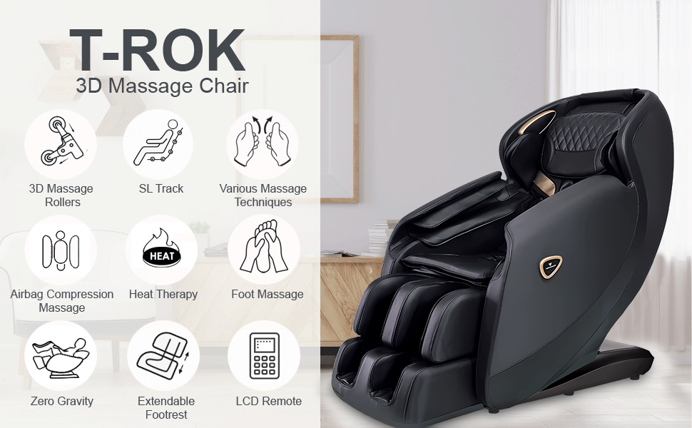 T-Rok massage chair has super long S & L track mechanism based on the most advanced technology available. Travelling from the neck it delivers a massage to the lower back pressure points and up to the thighs.